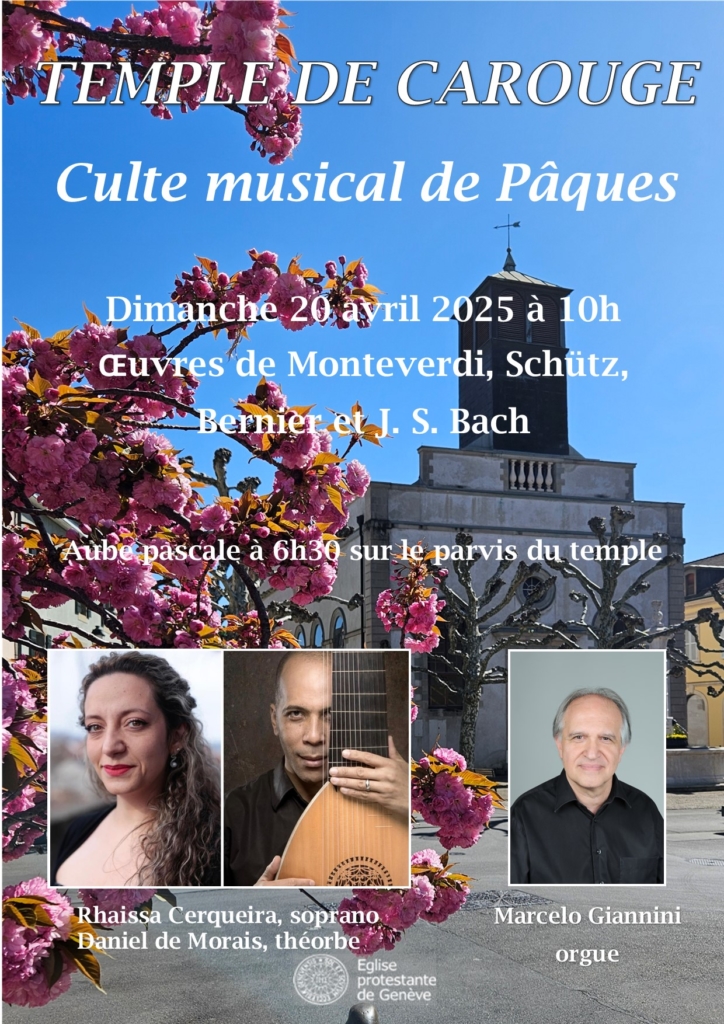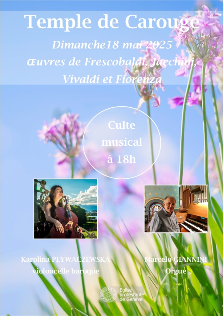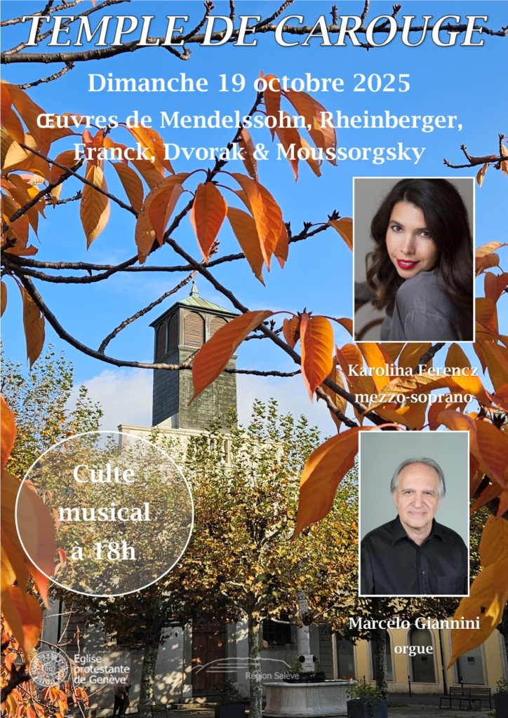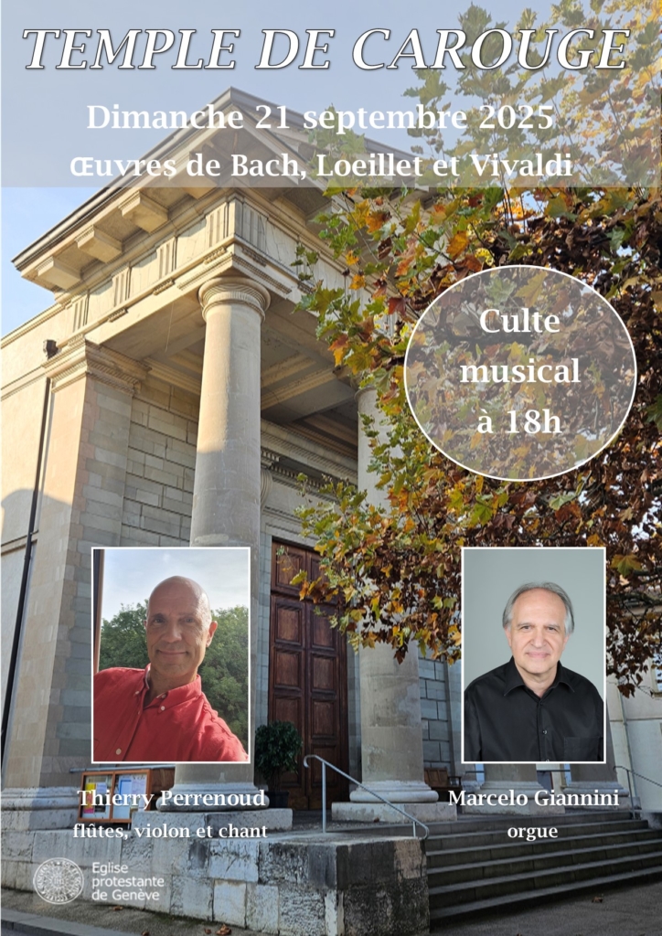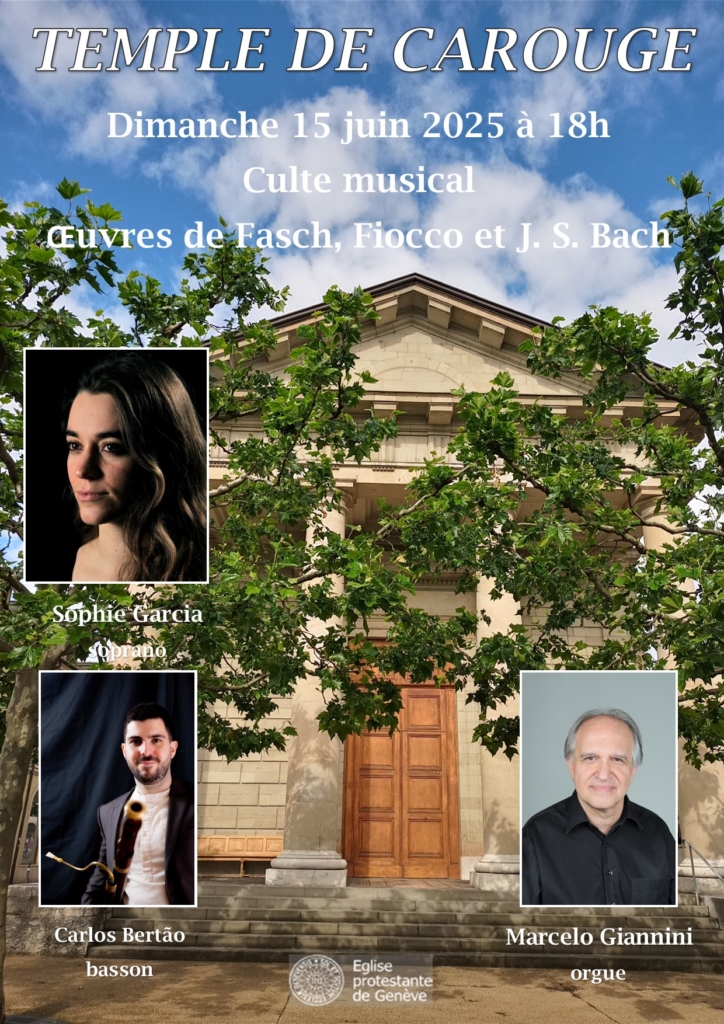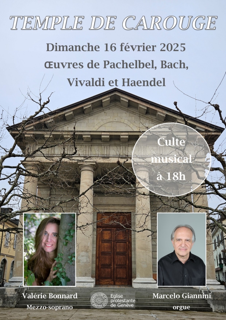 Les prochains cultes musicaux 2025, au temple de Carouge, auront lieu les dimanches, aux dates suivantes à 18h :